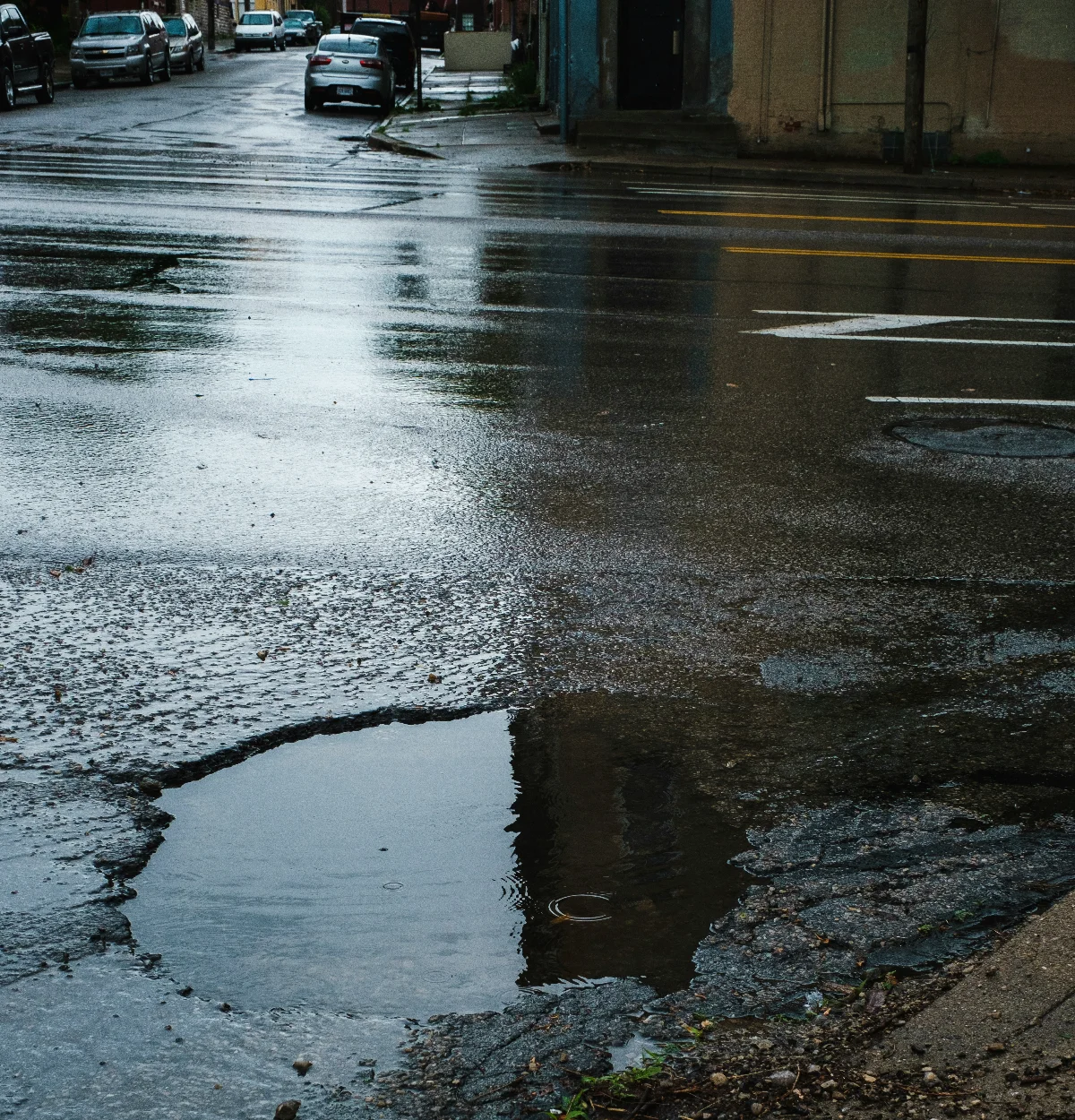 This particular pothole was repaired over several months, but the rain and cold reopened it.