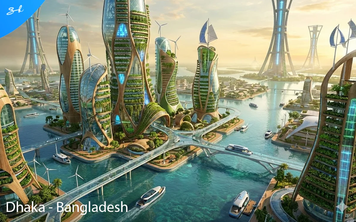 Continuing the theme that the 20 most populated cities will all be faced with rising water issues, Dhaka is imagined to be a beautiful paradise of nature and sustainable energy towers, becoming a powerhouse in self-sufficiency.