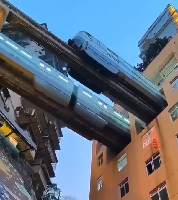 In China, there’s an apartment block with a fully operational railway running through its middle floors – but that doesn’t stop people from living there.