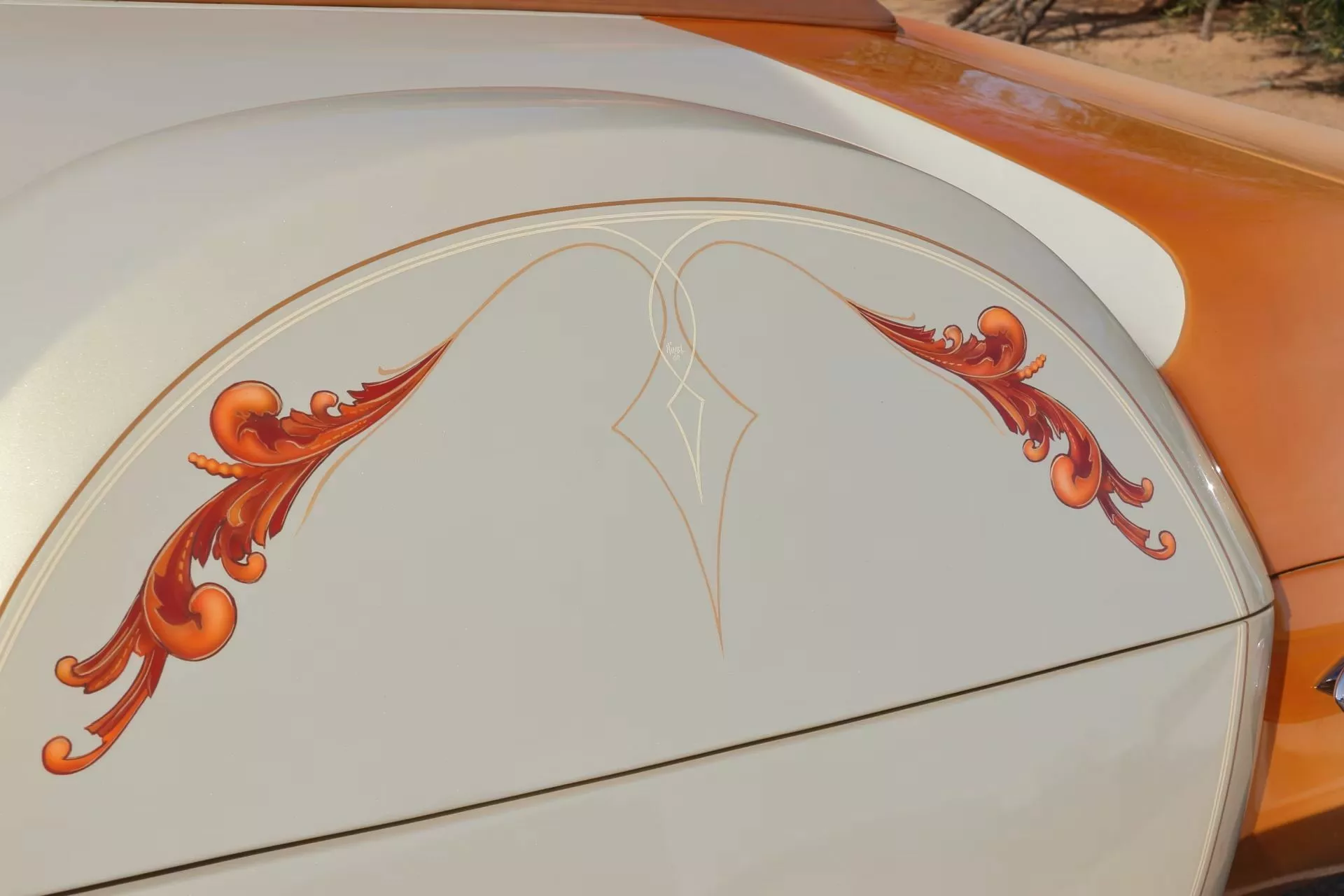 According to Mecum Auctions, the car wears a shimmering Gold Pearl clear coat with Ice Pearl accents and hand-painted graphics that only make sense if subtlety was never on the mood board.
