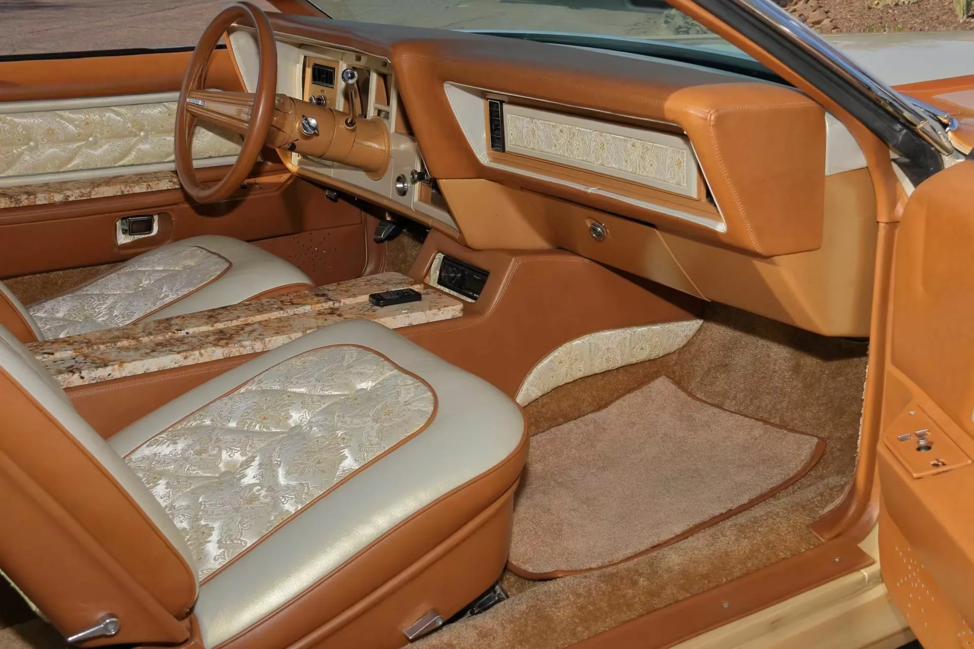 Instead of wood veneer or plush carpeting, inside you’re greeted by slabs of solid granite lining the transmission tunnel, rear console, and all four door panels.