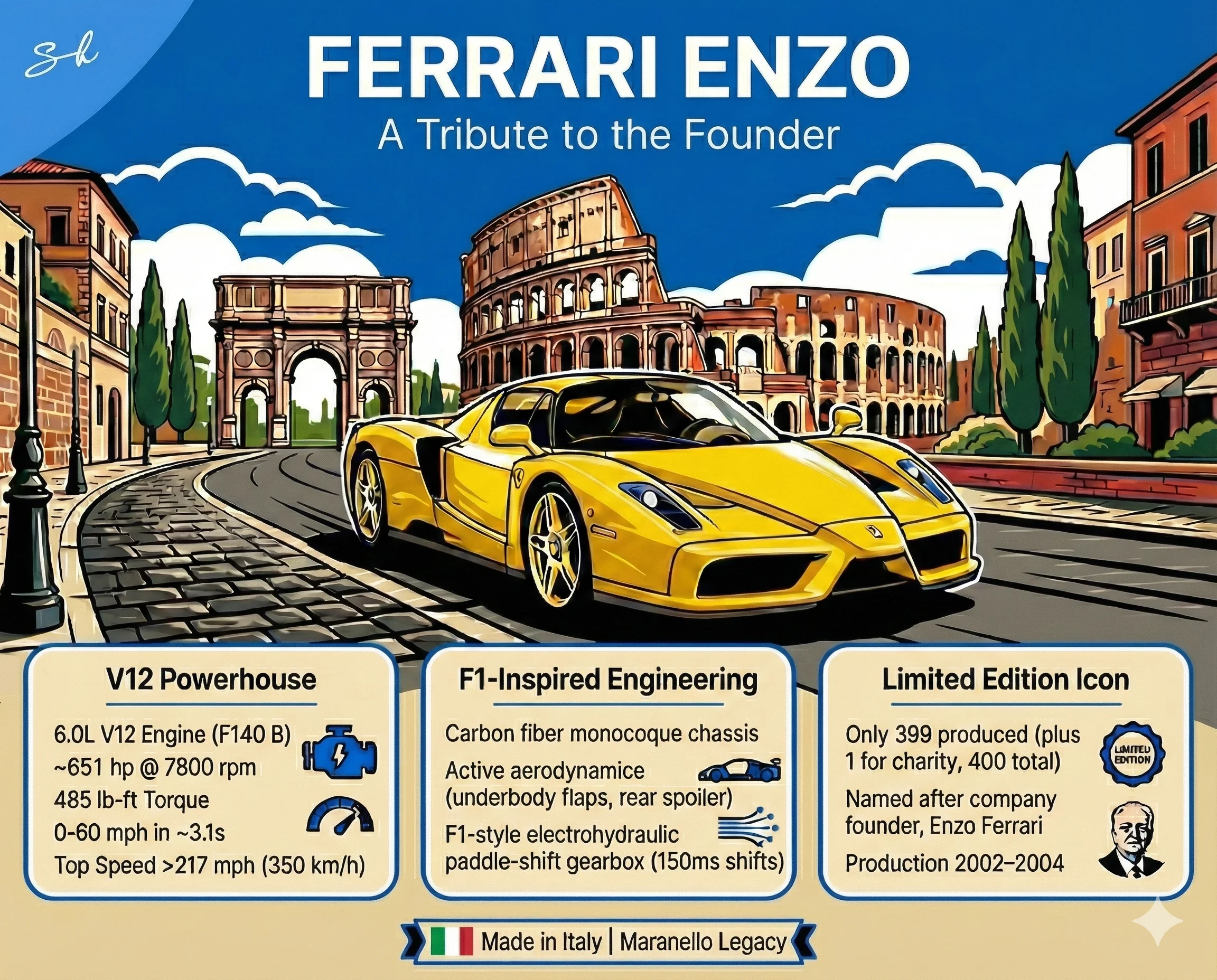 Many still consider the Enzo to be the greatest modern Ferrari, thanks to its screaming V12 engine, ferocious speed, and aggressive design.
