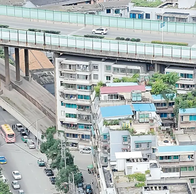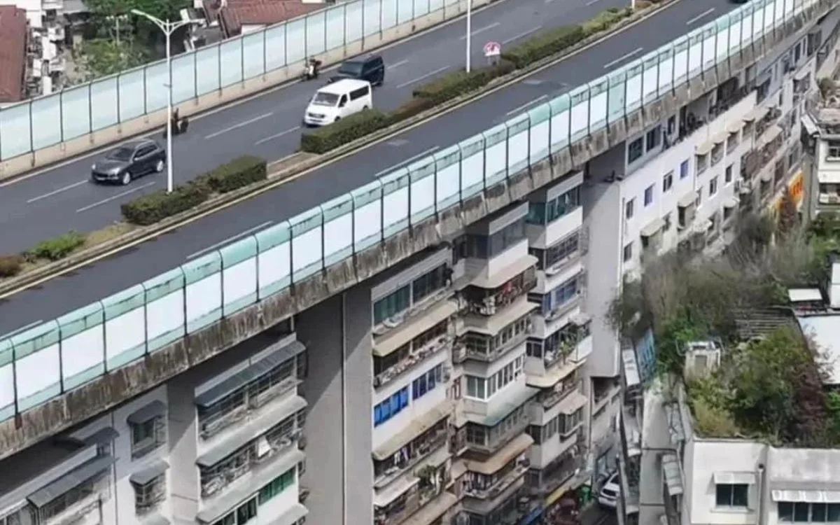 A real residential complex in Guiyang, China, was constructed directly under the massive Shuikousi Bridge highway, creating one of the most unusual living environments in the country.