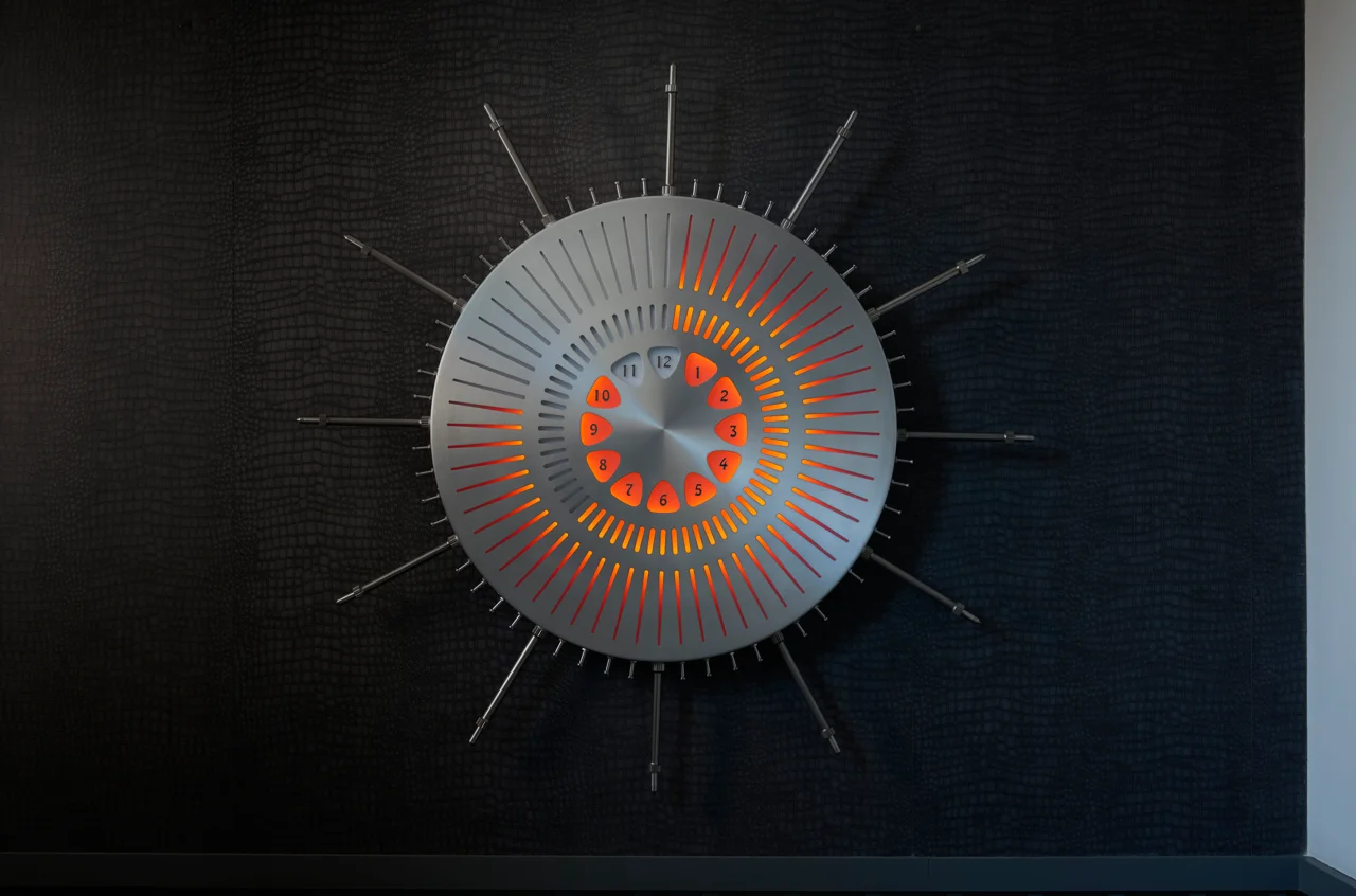 There’s a wall clock designed to tell the time using patterns of building light, taking influence from automotive designs like sports car wheels and digital speedometers.