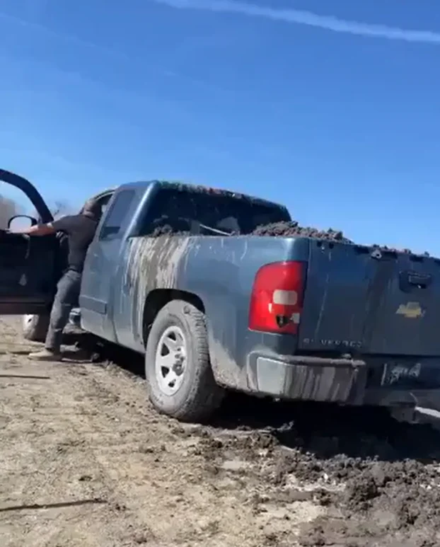 And this time, the ‘tools’ were a Chevy Silverado and a Ford F-150, filled with dirt and sacrificed to the river.