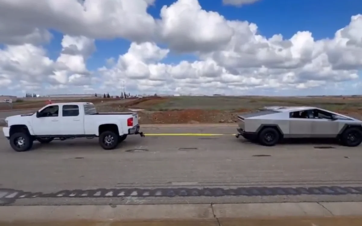 California man attempts tug-of-war with electric Tesla Cybertruck and diesel GMC Silverado, one struggles