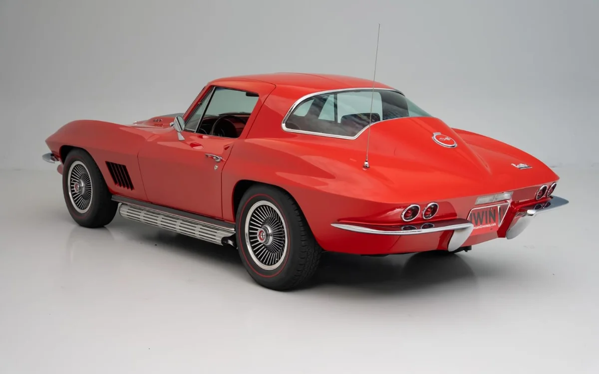 A fully restored 1967 Corvette Sting Ray Coupe, finished in Rally Red with a matching red interior.
