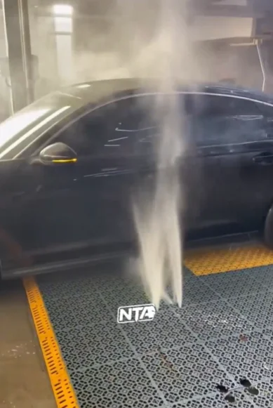 In the clip, the car enters a bay in which high-pressure jets of water blast up from the floor to clean the undercarriage and the wheels.