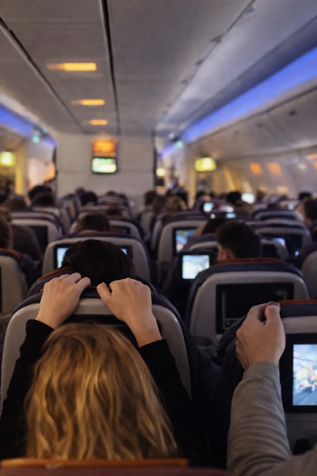 Hands are seen pressed firmly in seats, as screams rang out from around the cabin.