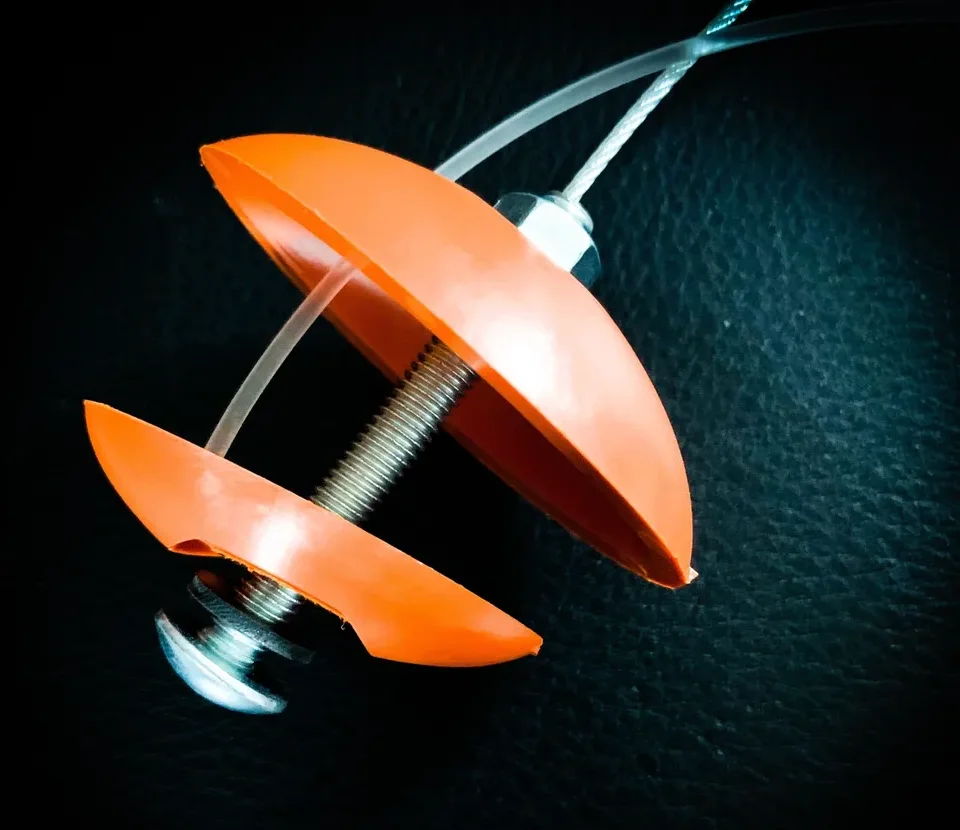 A bolt and washer are inserted into the sidewall, with the cable placed through the smaller of the cups.