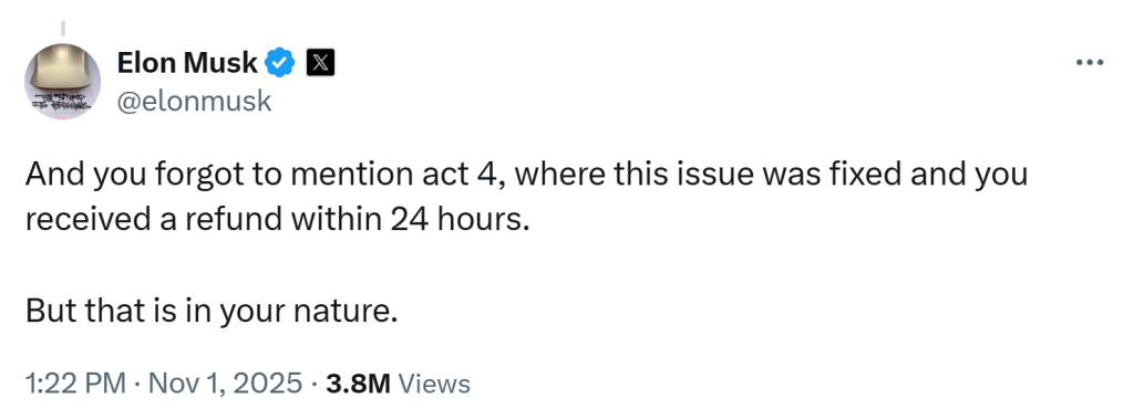 “And you forgot to mention act 4, where this issue was fixed and you received a refund within 24 hours,” Musk wrote on X.