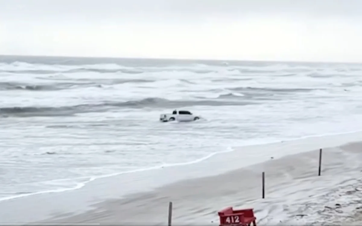 It was spotted by police driving up and down the sand and into the water, with waves washing over the truck.