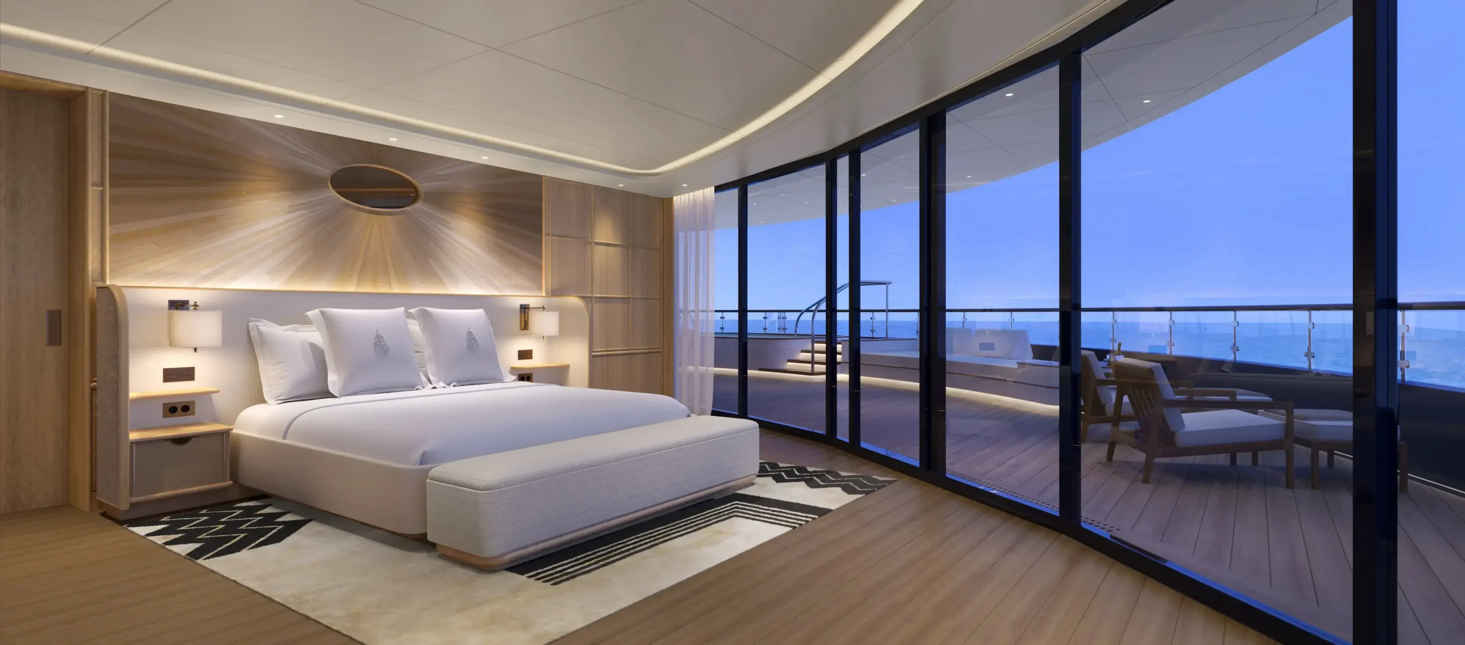 Every suite on the yacht includes floor-to-ceiling windows and private terrace access.