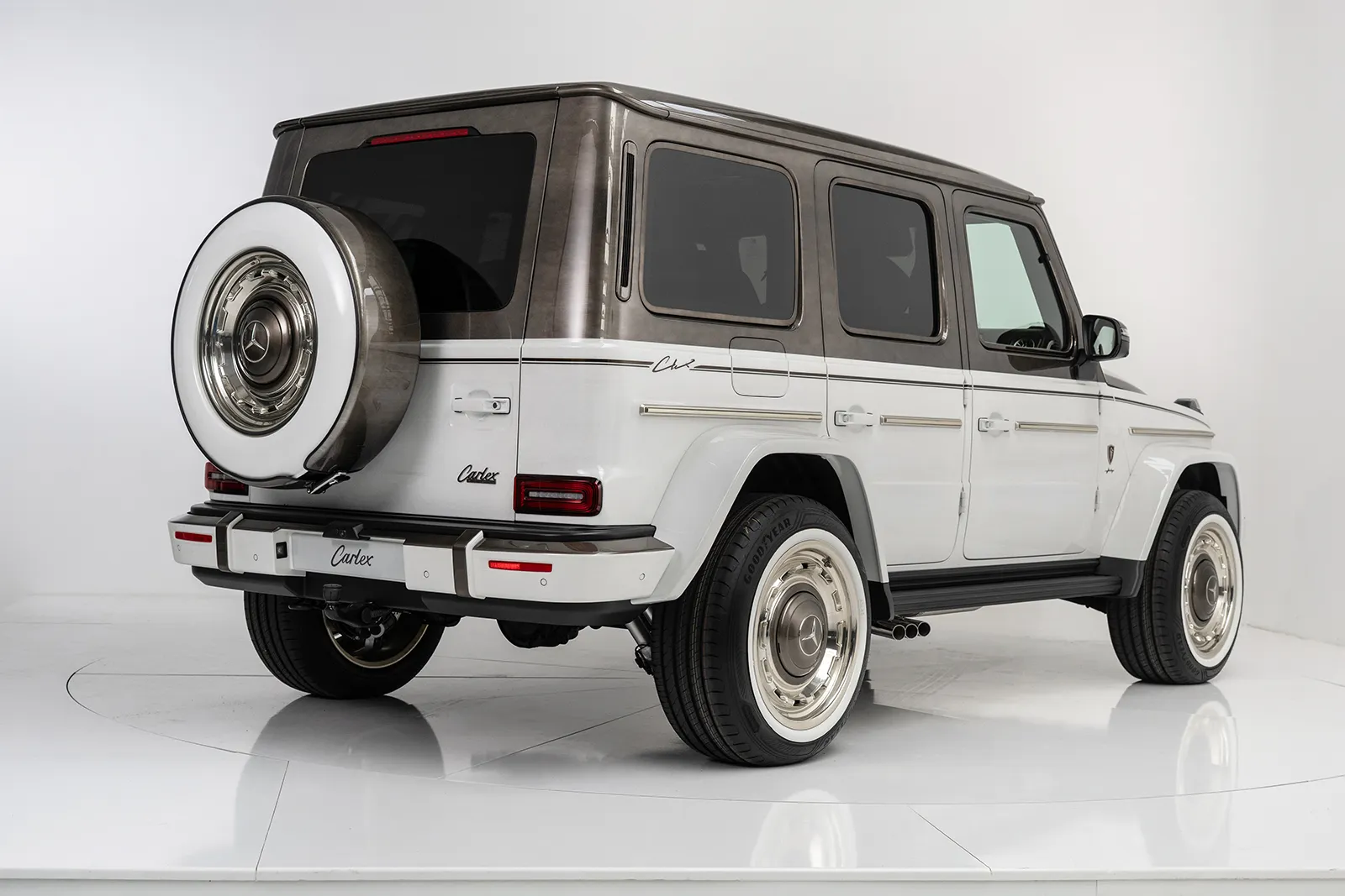 It has a two-tone white and brown finish, retro-inspired wheels, and a unique bodywork that instantly sets it apart from anything you’ve ever seen, while paying homage to the G-Wagen’s rugged background.