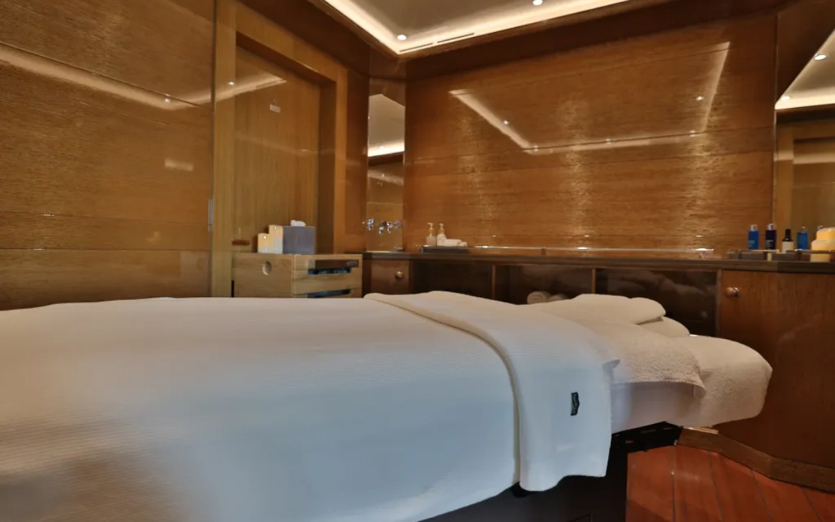 The gym features a fold-down balcony over the water, perfect for dramatic workout photos, while a hammam, massage room, and beauty salon cover the wellness side.