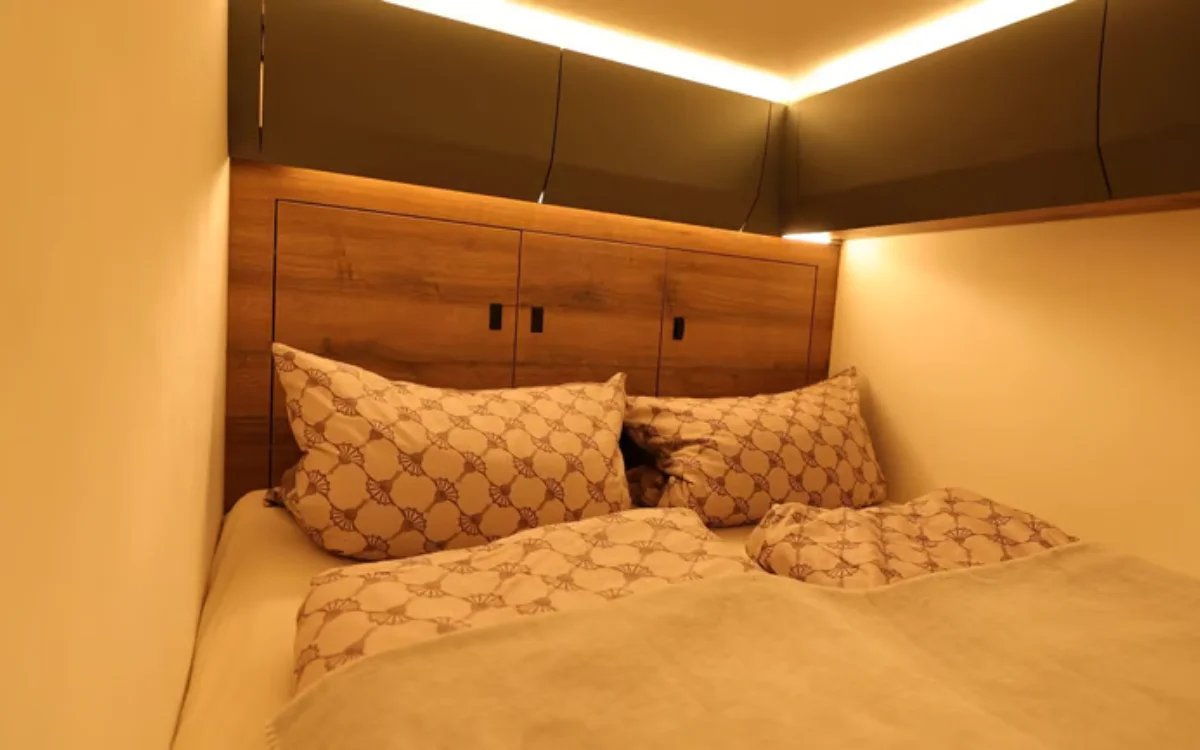 It sleeps up to six people and includes a full kitchen with a proper island, a real bathroom with a shower, and climate control throughout.