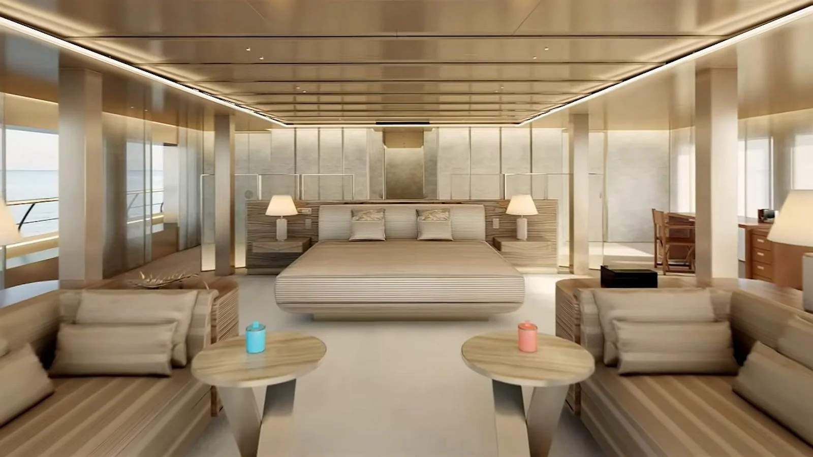 The yacht accommodates up to 14 guests across seven cabins, and a forward-facing owner’s suite sits on the main deck, offering panoramic views and added privacy, while a crew of 20 supports operations on board.