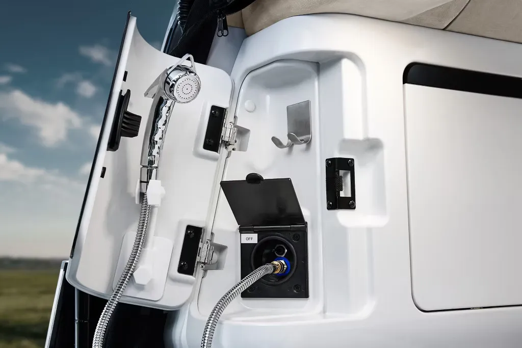 There’s a kitchen area, a 36-liter refrigerator, a portable showerhead, and a dedicated climate-control system.