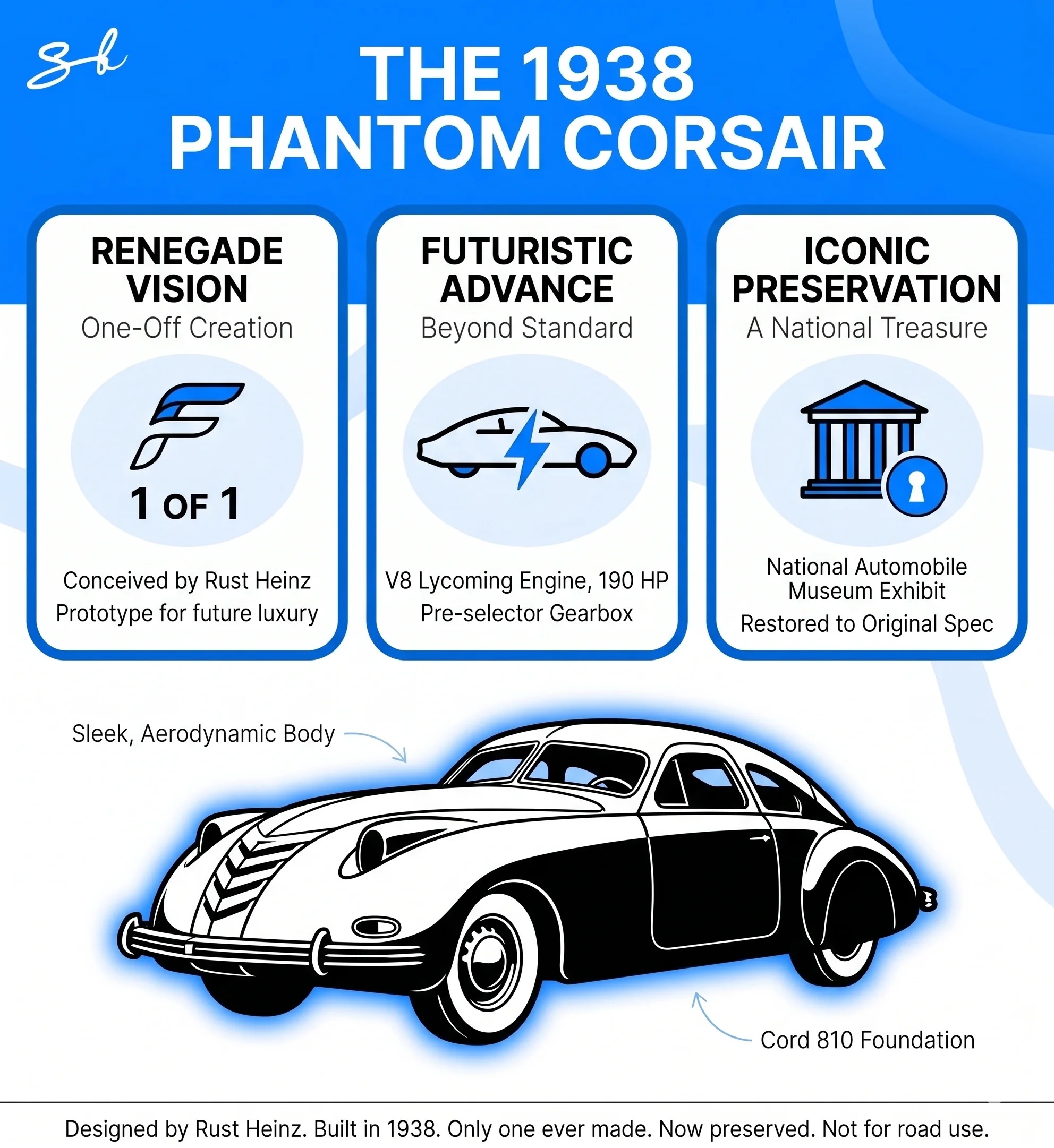 The 1938 Phantom Corsair is a distinctive concept car, which cost $24,000 to build back in the day.