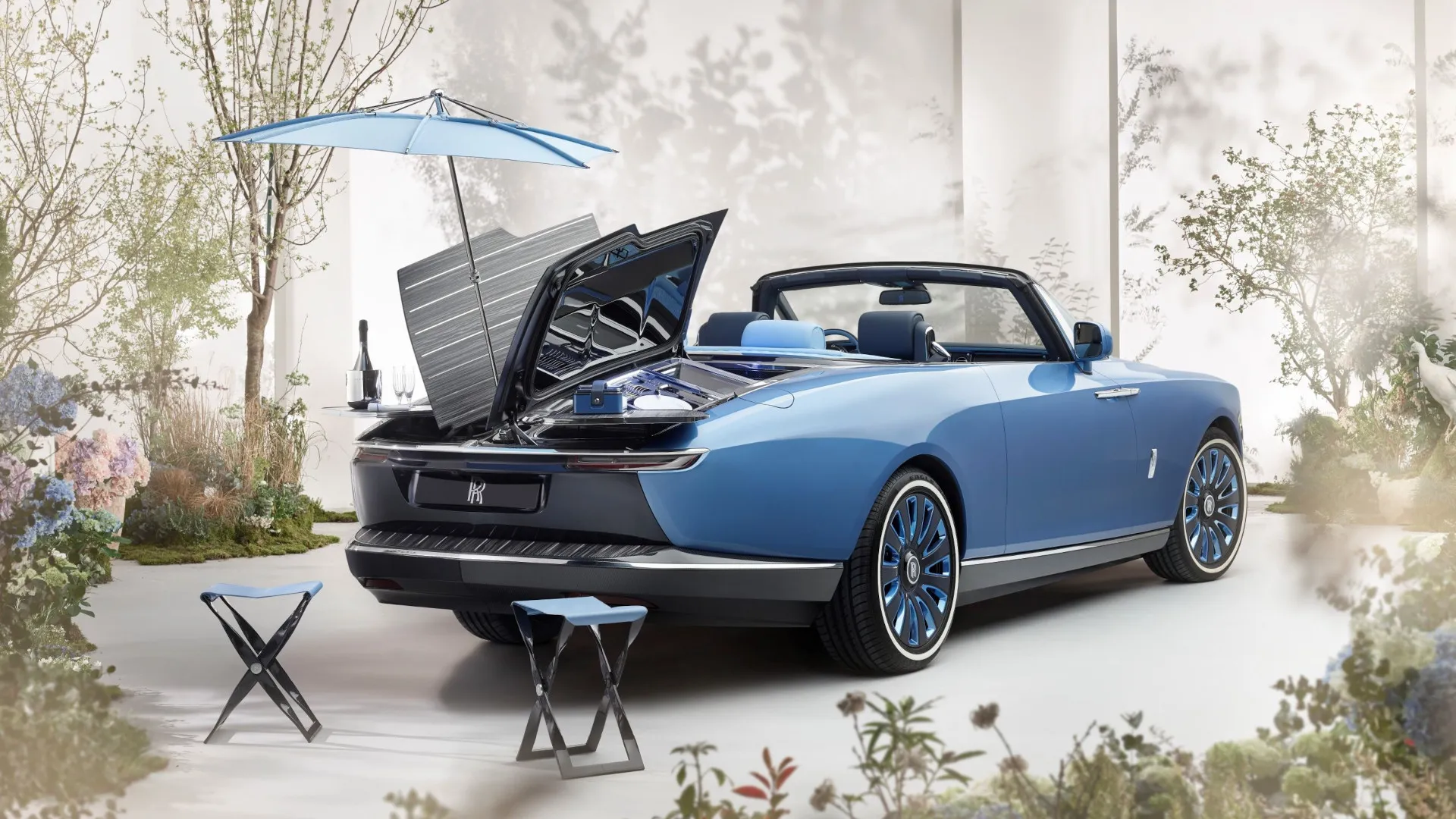 Perhaps the coolest feature that this car has is located in the rear, where compartments open up to reveal a champagne cooler, a Christofle picnic set, cocktail tables, matching chairs, and a full-sized parasol.