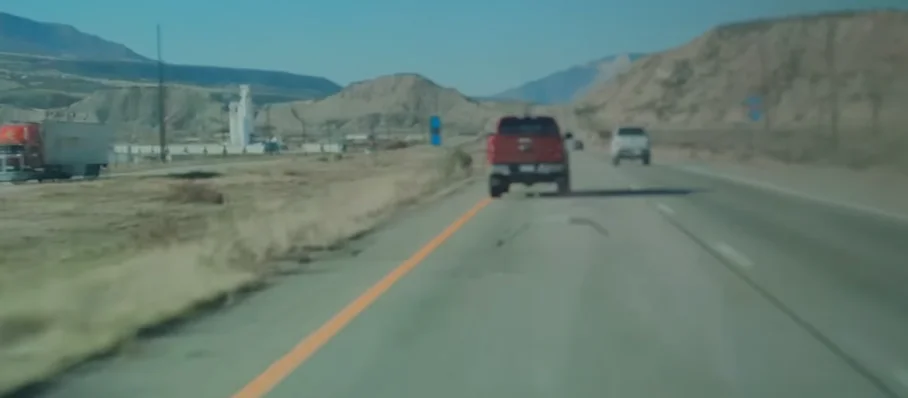At one point, as two trucks merged ahead of them, a metal piece got knocked off the ground and flew under their car.