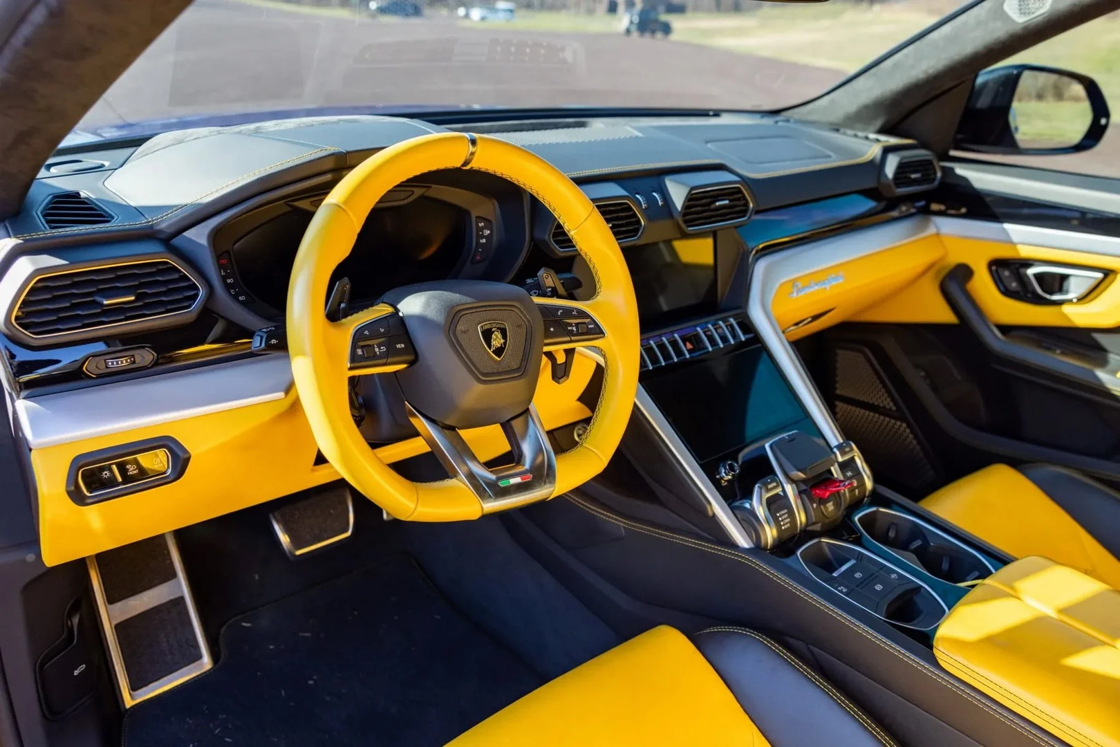 This SUV is now wearing a blue wrap to conceal the damage, but it was originally yellow, and it comes with yellow calipers and black-and-yellow upholstery for the interior.