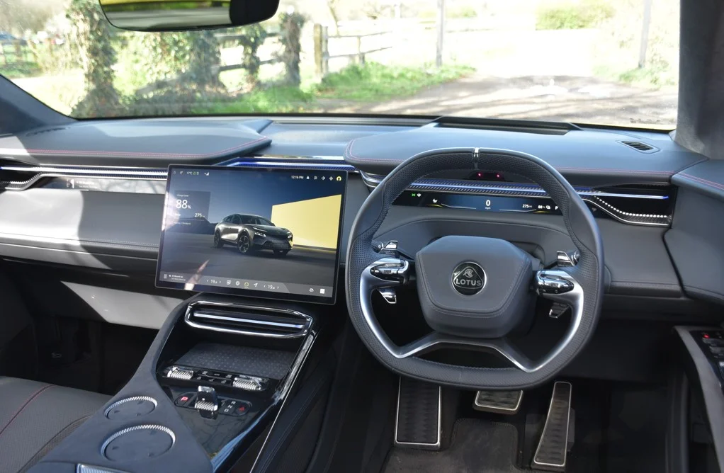 The Lotus Eletre offers a cabin environment that feels both sturdy and expensive, with every surface draped in leather or Alcantara.