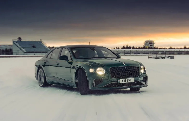 Despite the tricky conditions of the track, the car came equipped with studded 21-inch tires, swapped onto the standard production body of the Flying Spur.