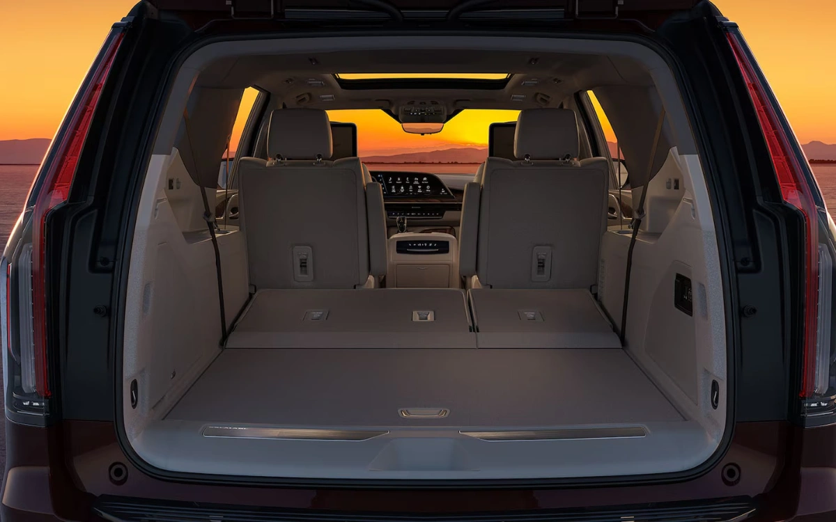 The Escalade ESV features Cadillac’s massive 38-inch curved OLED display, AKG Studio audio with up to 36 speakers, and available Super Cruise hands-free driving assistance.
