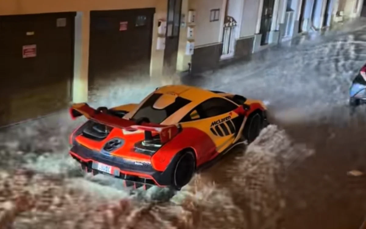 It kept a steady pace as water washed past its wheels, the whole moment looking completely out of place for a car usually seen in far cleaner conditions.