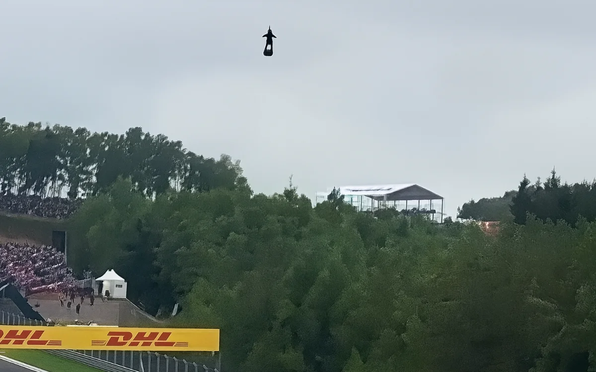 Is it a bird? Is it a plane? Nope, it’s some guy zooming past in a jetpack at the 2022 Belgian Grand Prix.
