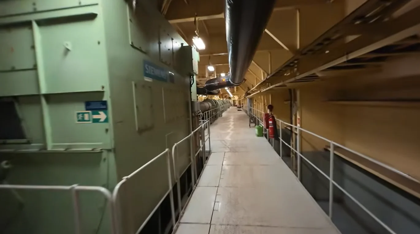 Near the bottom platforms, he shows ballast water treatment equipment and more pumps before entering the shaft tunnel.