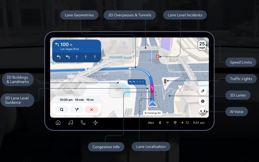 Unlike smartphone apps, Mapbox’s strength lies in deeply embedded, car-native experiences that feel purpose-built rather than mirrored from a phone.