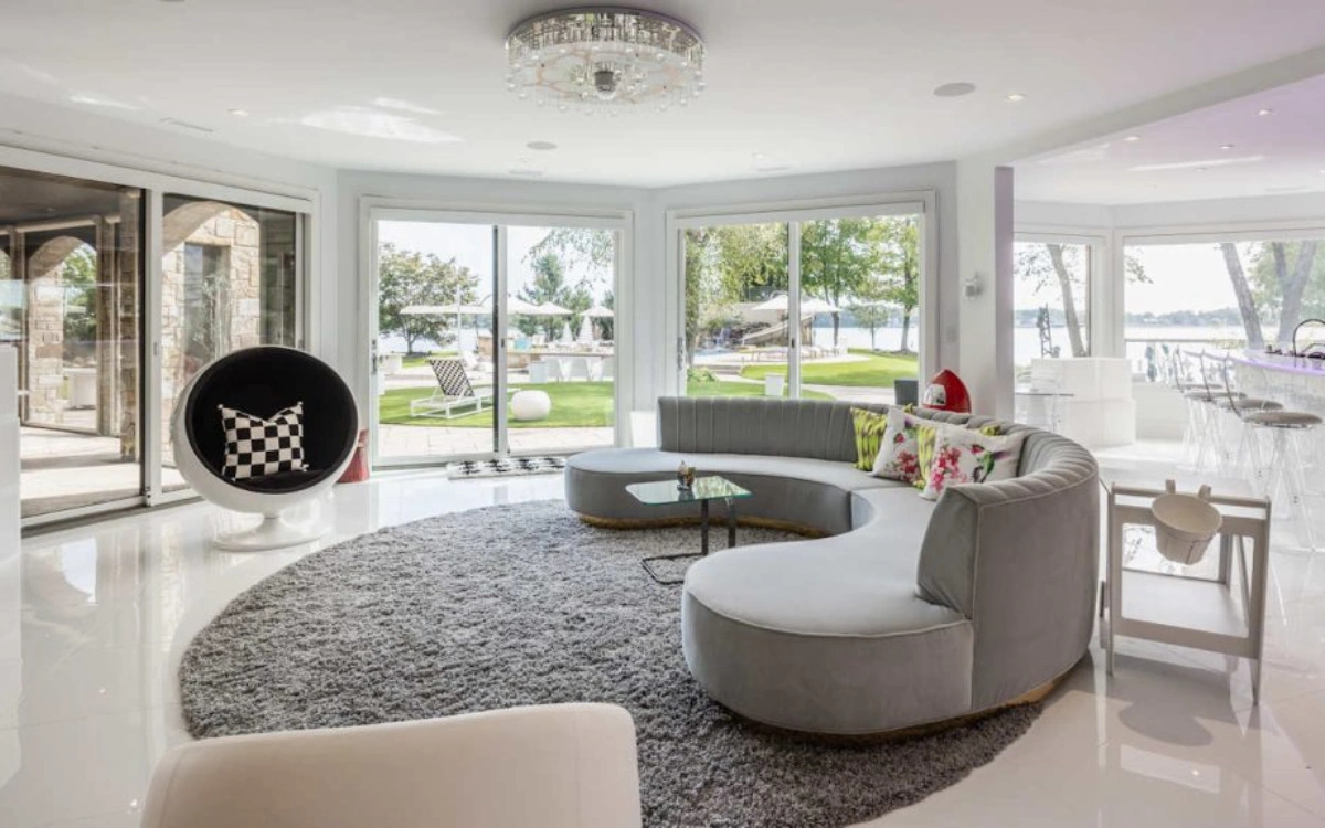 The result is an ultra-luxurious lakeside retreat with 570 feet of open-water shoreline, multiple homes within the estate, and a garage that looks like it belongs in an auto museum.