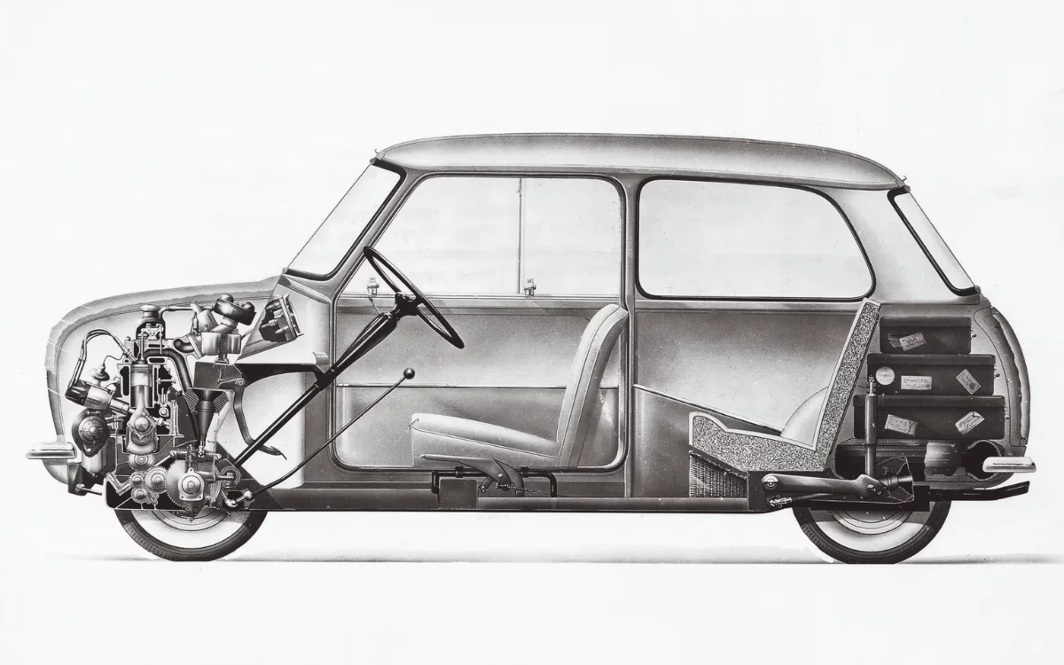 By turning the engine sideways, the Mini freed up space in a way earlier front-wheel-drive cars couldn’t.
