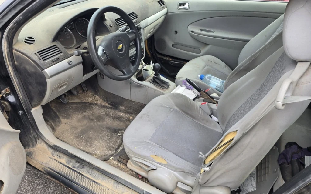 The interior is worn down, with torn seats and sand scattered across the floor.