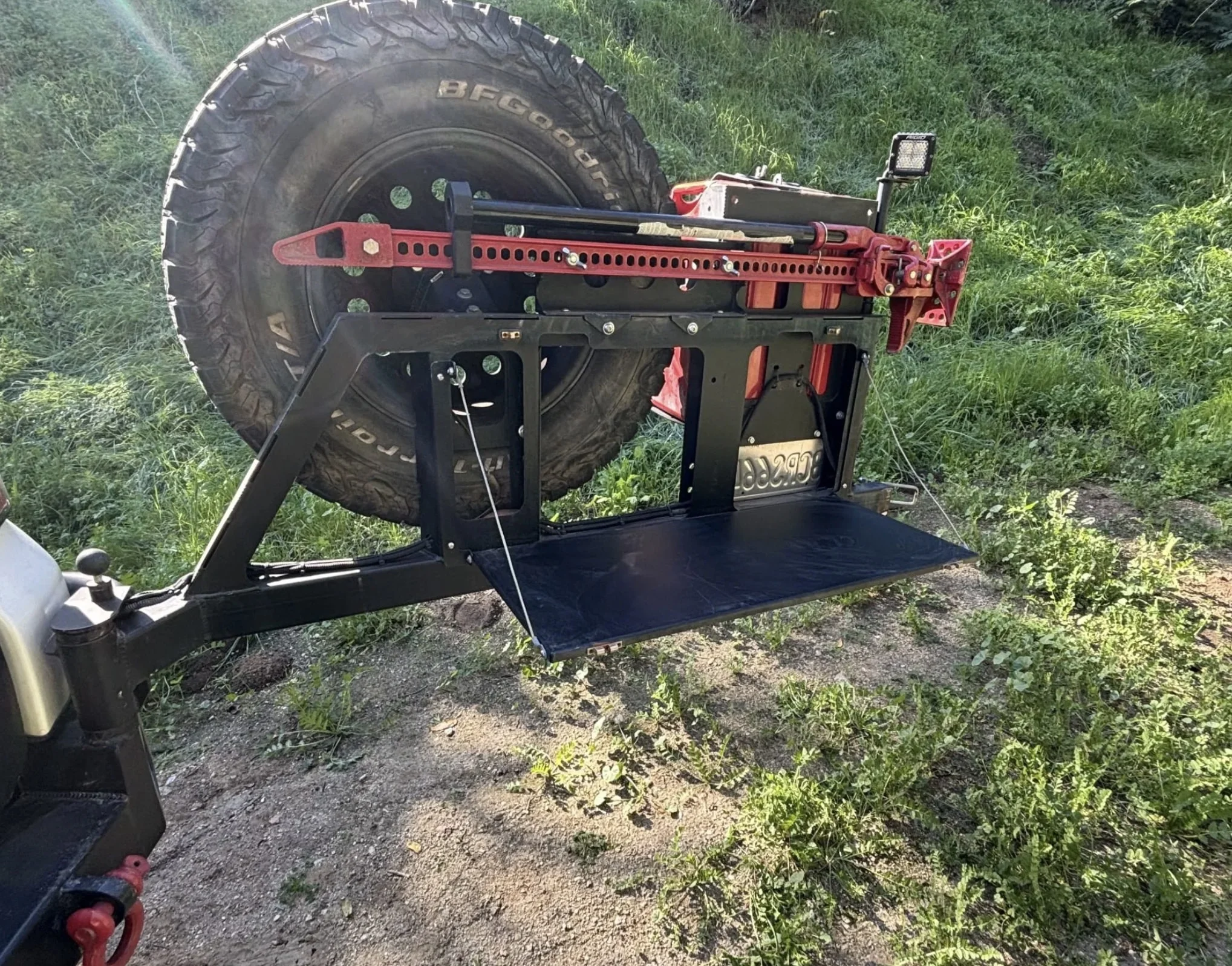 Out back, a swing-out carrier holds the spare wheel, jerry cans, an off-road jack, and even a fold-down tray table.