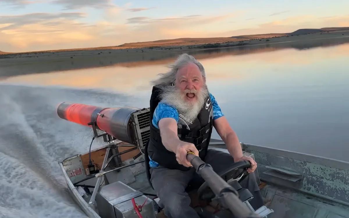 YouTuber Robert Maddox from CrazyRocketman mounted a pulsejet engine and its 230lbs of thrust to the back of a 1965 12-foot Sears fishing boat.