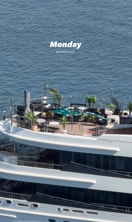Instead of pulling up quietly and letting the boat do all the talking, the owner turned the arrival into a full-scale spectacle by parking an Aston Martin F1 car on the deck.