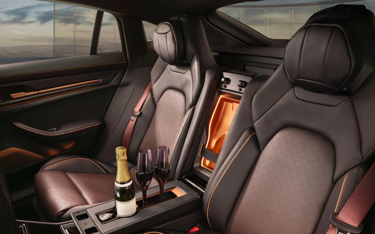 The showpiece sits between the rear seats: an illuminated champagne cooler paired with a dedicated cigar humidor.