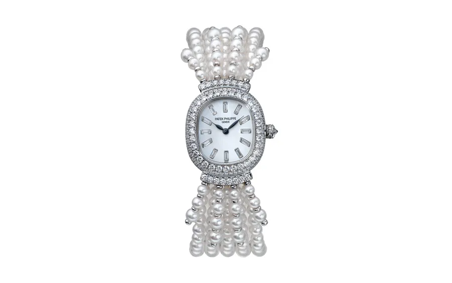The Patek Philippe Ref. 4975/1G is an extraordinary-looking watch, noted for its pearl bracelet and diamond-set case and dial.