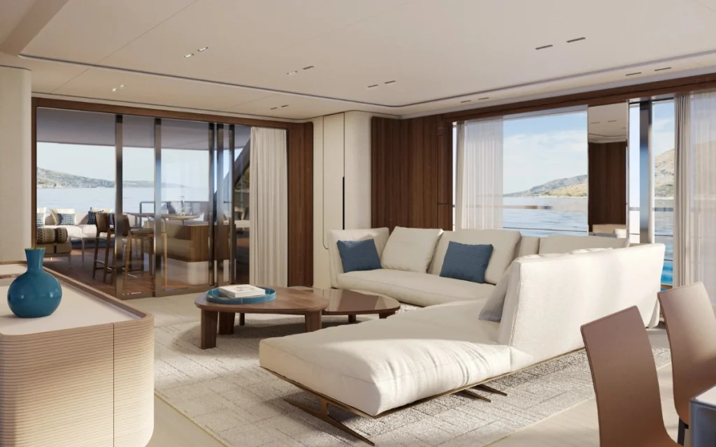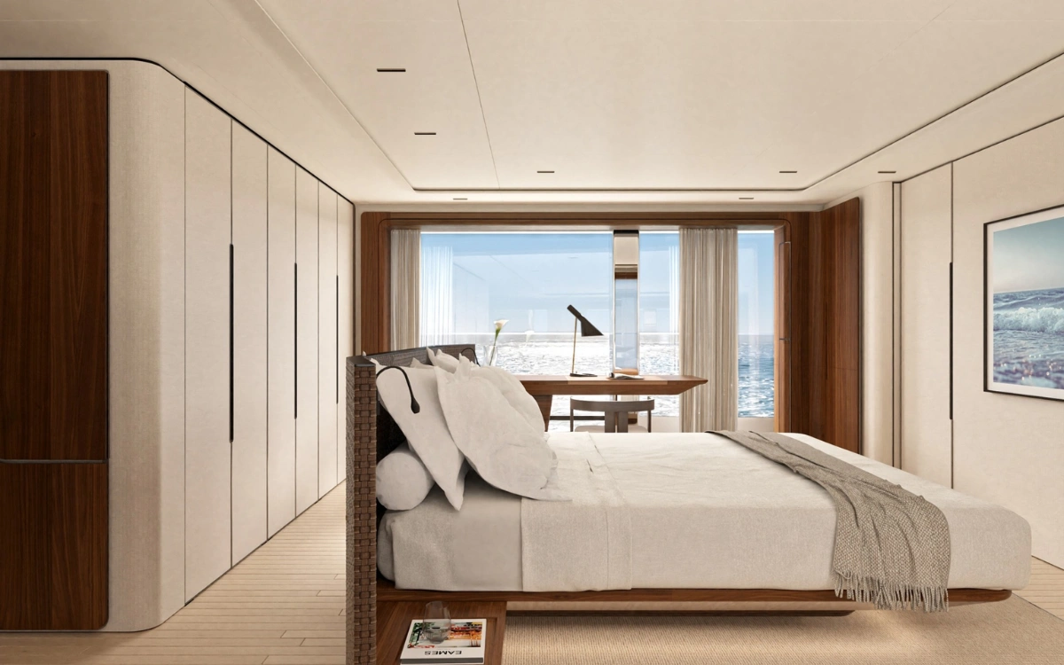 At just over 25 feet wide, the superyacht balances slender proportions with expansive interior volume.