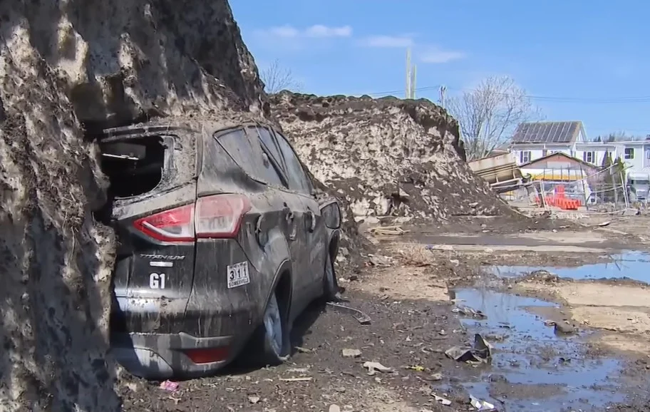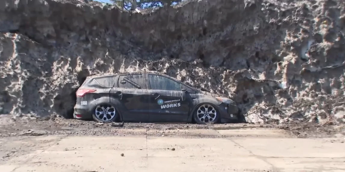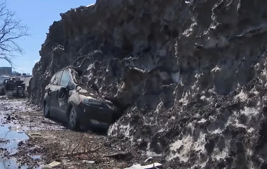 A massive snow pile in Somerville is currently surrendering a fleet of crushed city vehicles to the spring sun.