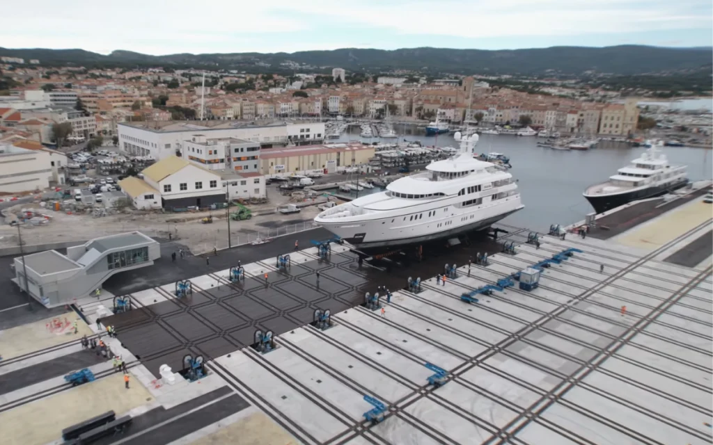 Despite the yacht’s 4,444 gross tonnage, the platform handled the haul-out smoothly before transferring the vessel inland for heavier works.