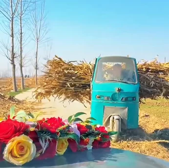 In one vehicle is a newly-wed couple, and in the other is a man carrying what looks like crops in his car.