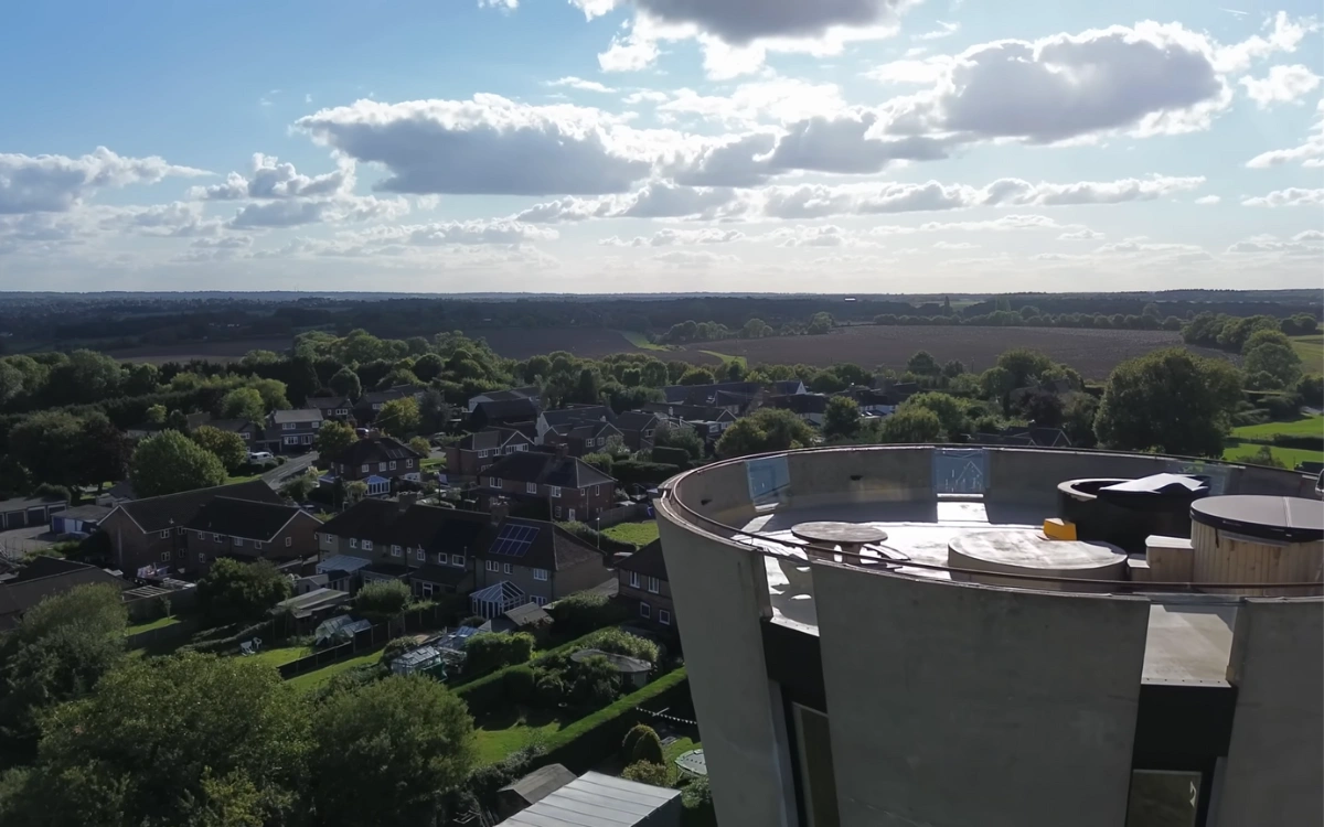 The former water tank at the summit is now the main kitchen and living space, a circular room wrapped in windows and countryside views.