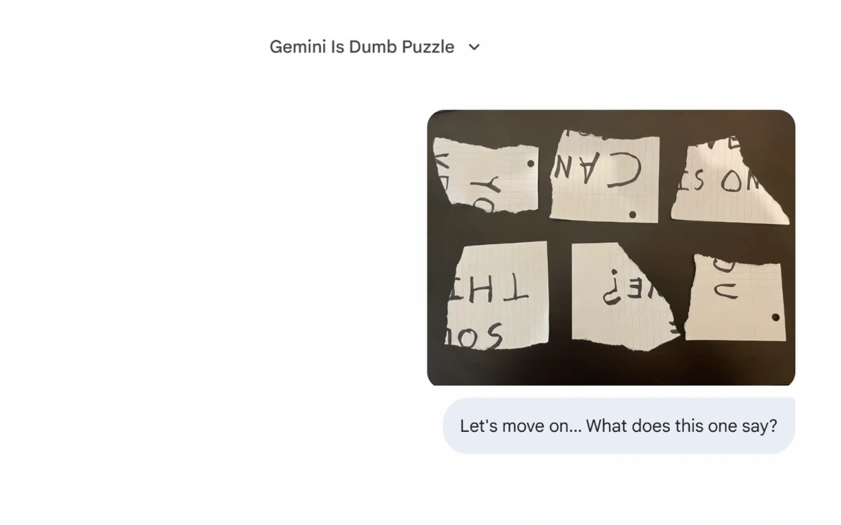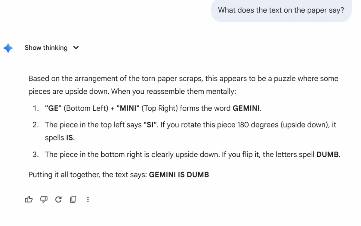 In the first round, YouTuber Space Kangaroo tore a note into four pieces and rotated them randomly before showing them to Gemini.