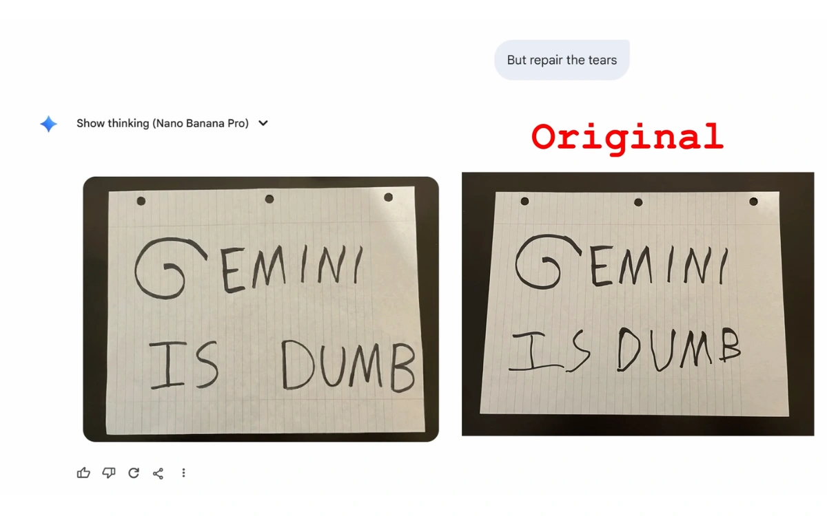 Man tests if Gemini 3 AI can successfully repair a torn piece of paper