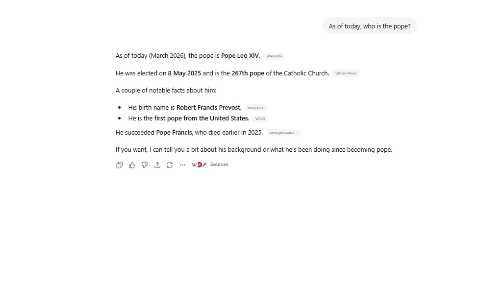 If your question depends on current events or recent updates, you need to ensure it is using live data, otherwise, the answer might be outdated even if it sounds confident.