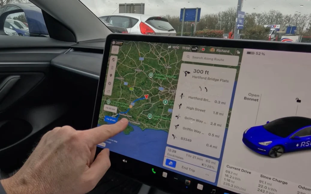 The Tesla Model 3 maintained a rigorous schedule that included airport runs to Heathrow and business trips to Birmingham and Ipswich.